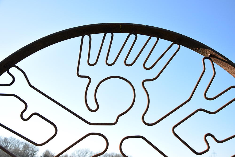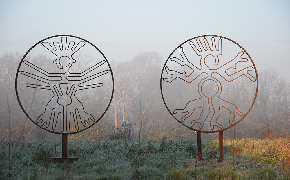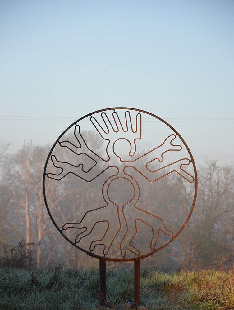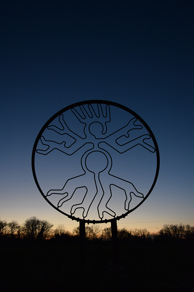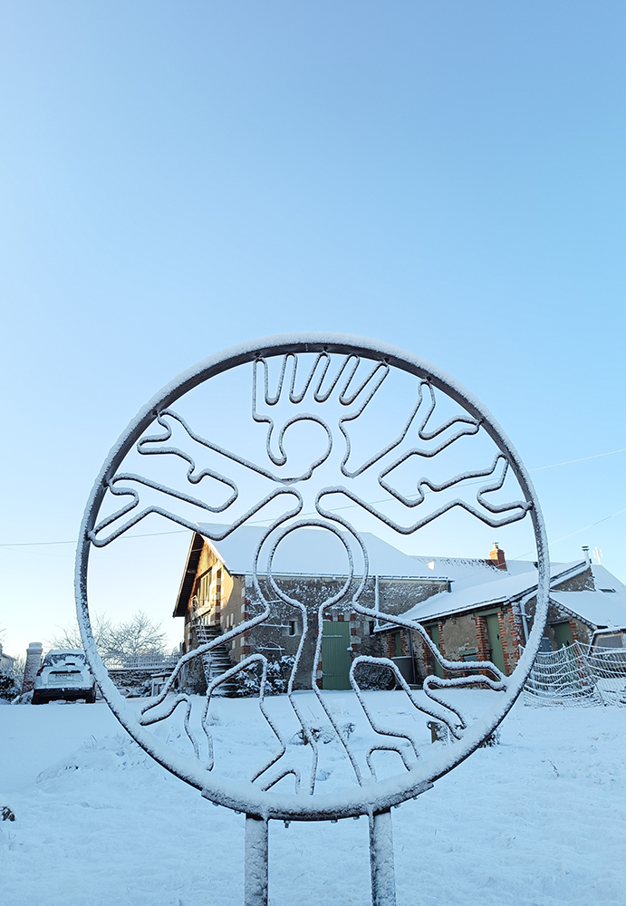 Plusieurs éléments de mon histoire personnelle sont présents dans cette sculpture chimérique : mon intérêt pour les géoglyphes de Nazca dessinés en « uniligne », pour le panthéon hindouiste avec la déesse androgyne Shiva, pour Léonardo De Vinci avec son « homme de Vitruve », pour le premier métier de mon père qui fabriquait de roues de charrette, et pour bien d’autres choses encore…